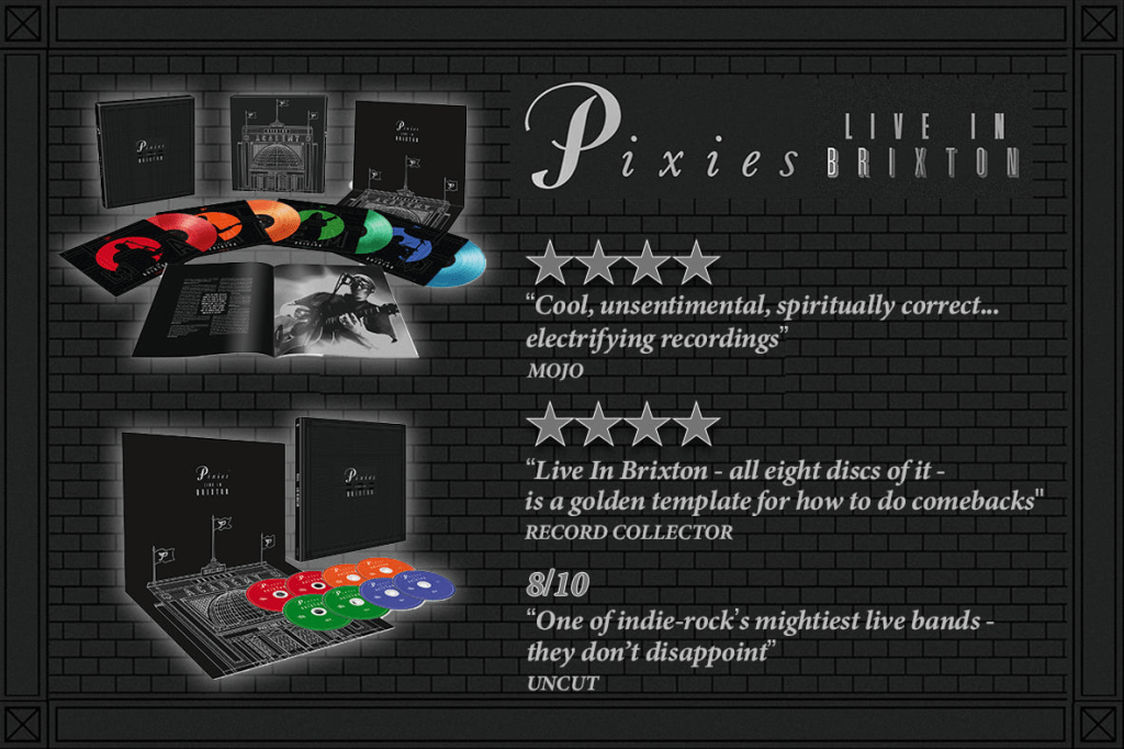 Pixies have announced a new box set capturing their June 2004 reunion concerts at London’s Brixton Academy. Live in Brixton arrives January 28th in vinyl and CD editions. The collection includes live versions of songs from Doolittle and Surfer Rosa, as well as covers of Neil Young’s “Winterlong,” Peter Ivers’ “In Heaven,” the Jesus and Mary Chain’s “Head On,” and more, all newly mastered by Phil Kinrade at Alchemy Mastering.