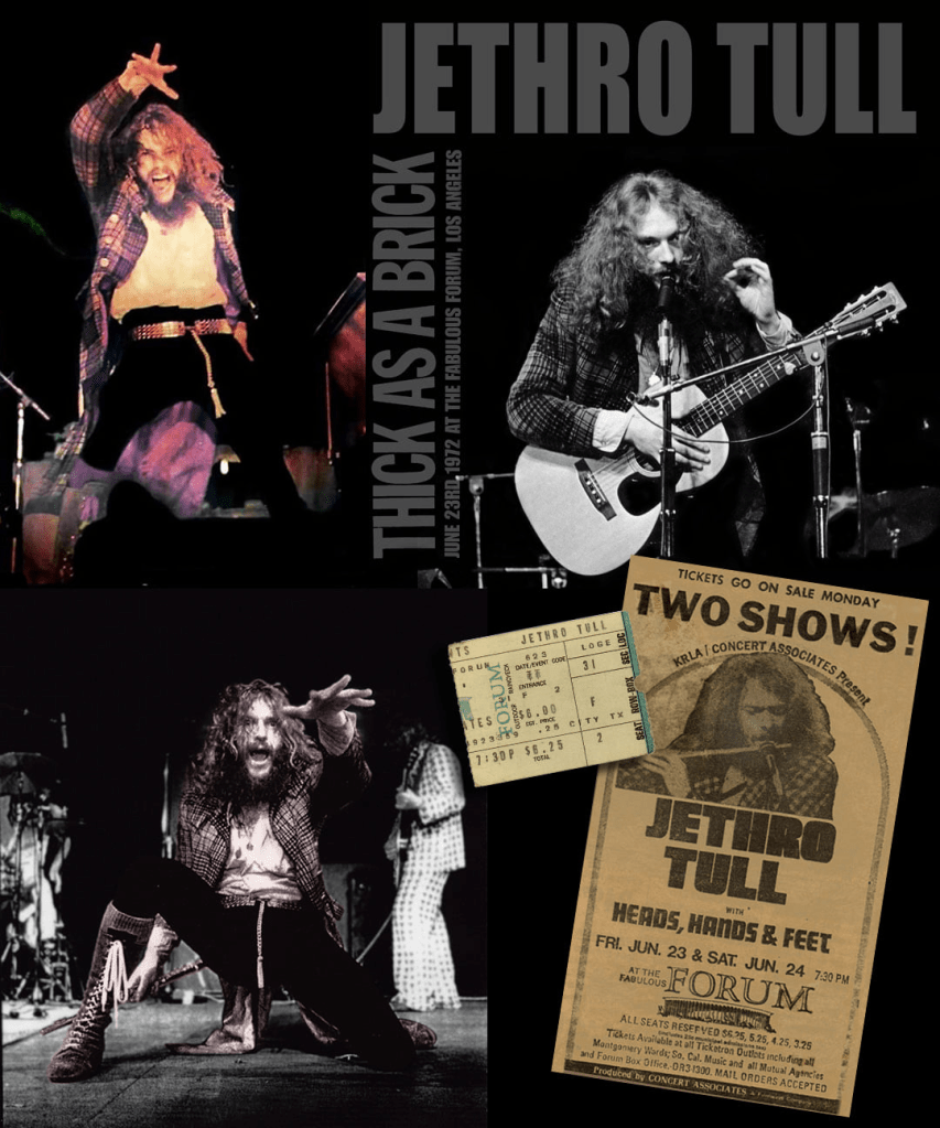 Jethro Tull live audio at the Los Angeles Forum June 23rd1972. This is one of my favourite bootlegs of the “Thick As A Brick” tour with great sound and a very enthusiastic audience, so I dressed it up with lots of photos. I especially like how Jeffrey’s bass playing comes to the front in the mix.