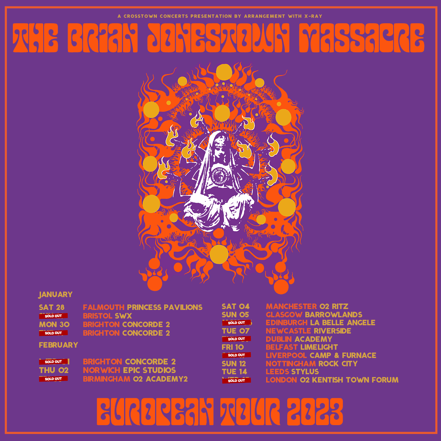 The dates are 28/01/23 U.K Falmouth – Princess Pavilions , 29/01/23 U.K Bristol – SWX , 30/01/23 Brighton- Concorde 2 , 31/01/23 U.K Brighton – Concorde 2 . 01/02/23 U.K Brighton – Concorde 2 , 02/02/23 U.K. Norwich- Epic Studios , 03/02/23 U.K Birmingham – Academy 2 , 04/02/23 U.K Manchester – Ritz , 05/02/23 U.K Glasgow – Barrowlands , 06/02/23 U.K Edinburgh – La Belle Angele , 07/02/23 U.K Newcastle – Riverside , 09/02/23 IRELAND Dublin – Academy , 10/02/23 U.K Belfast – Limelight T 11/02/23 U.K Liverpool – Camp & Furnace , 12/02/23 U.K Nottingham – Rock City , 14/02/23 U.K Leeds – Stylus , 15/02/23 U.K London – Forum ,