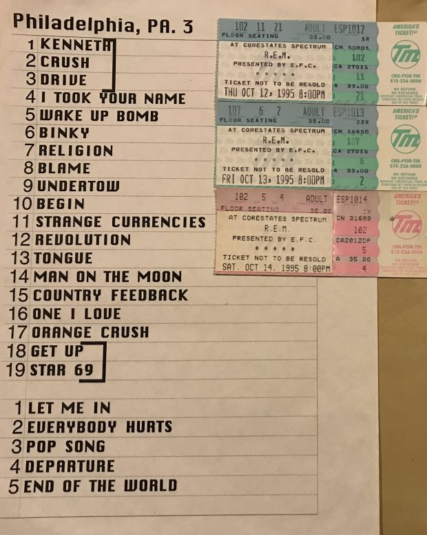 Seeing R.E.M. at the Spectrum on 10/13/95 changed everything I thought about music. They did so many things that young me never thought a band selling out arenas might do. I remember hearing or reading interviews where they plainly stated that this would not be a greatest hits tour; they would be playing mostly “Monster” material and songs written while on tour. That night, I found that the energy of a set like that tops any nostalgia set. All of my favorite shows since then have been mostly new material. Hearing a new song for the first time in a live setting is maybe the most exciting moment of any show for me.