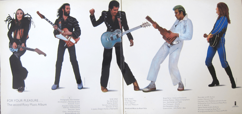 In terms of packaging, Roxy Music’s suave European futurism was glam incarnate. If you’re looking for a single image to accompany glam’s encyclopedic entry then look no further than “For Your Pleasure’s” inner sleeve. Bryan Ferry’s bolero Elvis; Andy MacKay’s green-flecked quiff; Eno’s space age lady-boy… here, at last, was an album that looked exactly like it sounded. A million stylistic miles from the sluttiness of their contemporaries, Roxy Music offered sophistication, ennui and lounge lizard languor. No proletarian foot-stomping on “In Every Dream Home A Heartache”, just casual, alienated, impenetrable cool.
