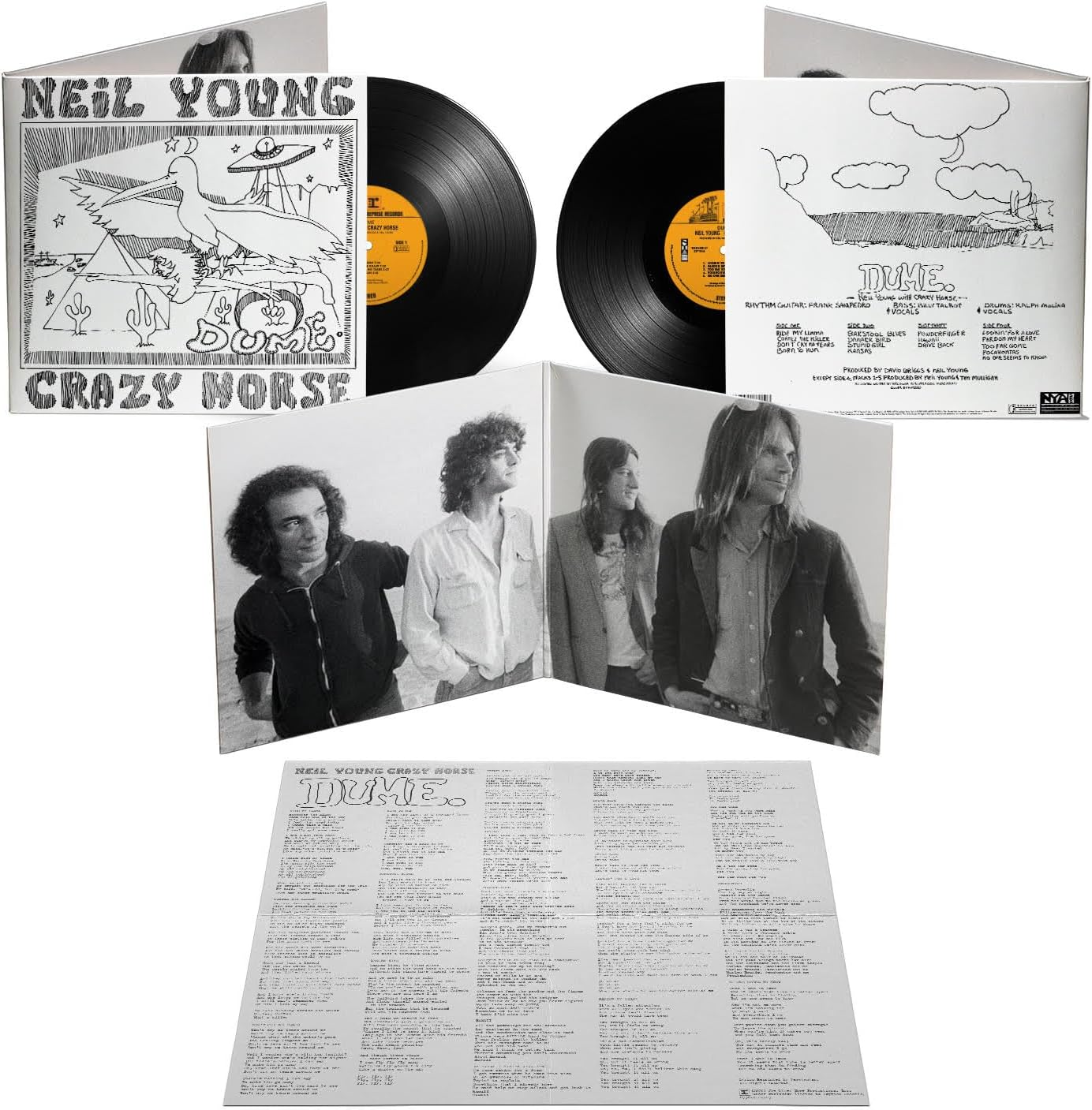 Neil Young, Crazy Horse, and producer David Briggs were living in the Point Dume area of Malibu and recording at their own direction. The songs Young was writing on the “Dume” collection came at a steady stream, and after the twisty turns of ‘Tonight’s The Night’, the group felt open and free. “Zuma”, named after the beach they lived near, came together in wide-open sessions that had the air of freedom itself. In assembling “Dume“ – initially released as Disc 8 of the ‘Archives Vol. II’ box set – Young’s unfolding plan was to weave songs from the album with unreleased tracks and mixes from that period. ‘Dume’ is somewhat of a Mad Hatter’s take, using the “Zuma” album as a starting point and expanding that scope into a brand-new entity. Now it is available with the superior sound it was recorded in, via analogue master tapes and vinyl.