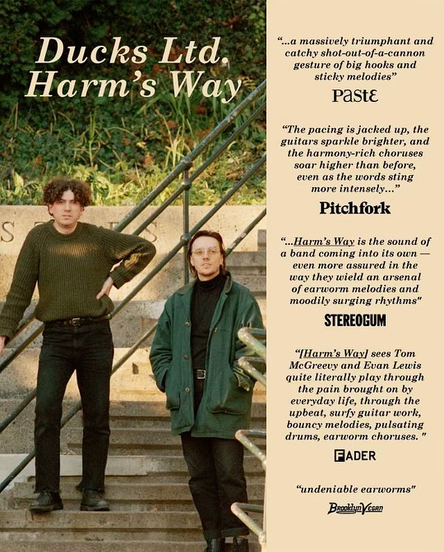 On “Harm’s Way”, the duo of McGreevy and guitarist Evan Lewis hones in on interpersonal and societal collapses, urban decay, and the near-impossibility of keeping a level head when everything around you seems to be falling apart. Even with its often dark subject matter, the album is Ducks Ltd.’s most vividly rendered and collaborative collection yet. It’s an undeniable evolution for the band, not just in how these songs soar, but in their entire writing and recording processes. Composed on tour while supporting acts like Nation of Language, Illuminati Hotties, and Archers of Loaf, “Harm’s Way” displays the band’s finely tuned songcraft and well-earned, road-tested confidence.