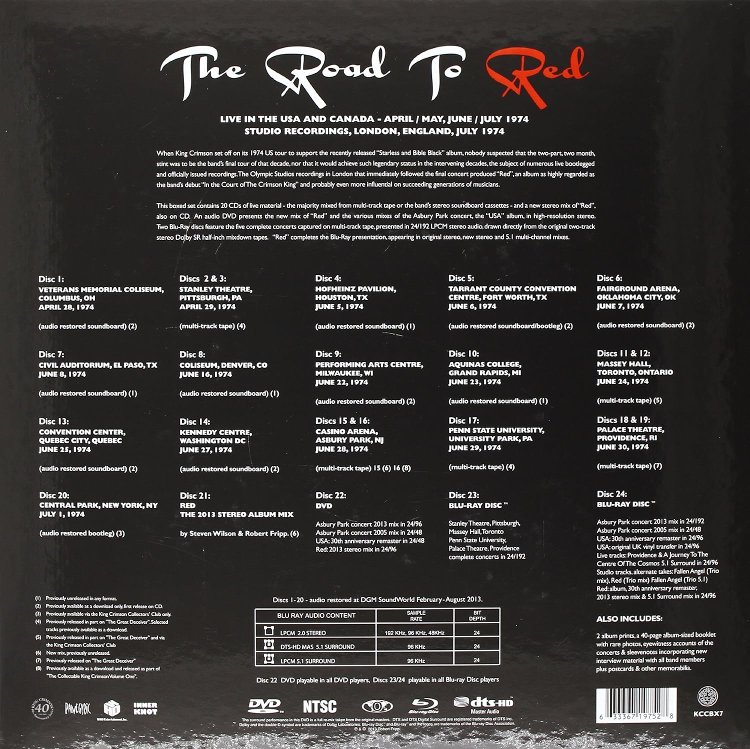 20 CDs of live material from the final USA & Canadian 1974 tours, 1 CD of studio material featuring a new stereo mix of “Red”, 1 DVD featuring various versions of the “USA” album/concert, 2 Blu-Ray discs featuring 5 complete concerts in high-resolution stereo + “Red” in hi-res stereo & 5.1, 12” box with booklet, memorabilia & album prints. Limited to one worldwide pressing.