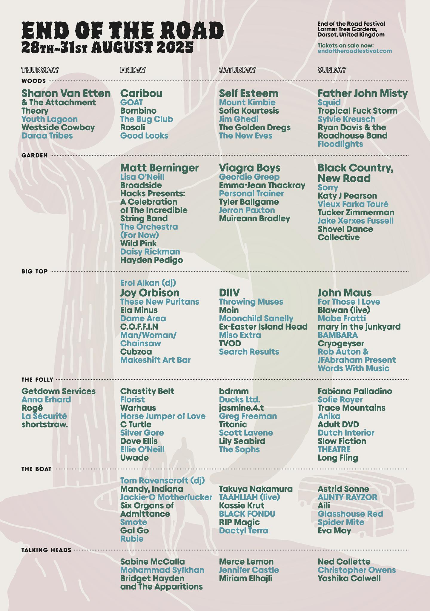 Saturday is topped by fearless pop brilliance from Self Esteem, who will follow Mount Kimbie, Sofia Kourtesis and Jim Ghedi. Viagra Boys, Geordie Greep and Emma-Jean Thackray grace the Garden Stage, whilst DIIV bring their noise-rock romance to the Big Top. Down at The Folly, bdrmm, Ducks Ltd and jasmine 4.t will warm up the stage for your usual high-energy late-night Surprise Shows.