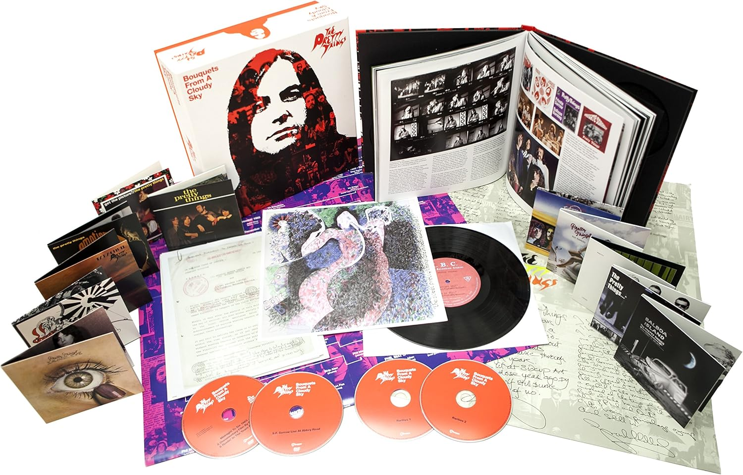 This Box Set includes 11 Studio Albums, 2 Rarities CDs, 2 DVDs, 10″ Replica Acetate, Hardback Book, ‘Bouguets From A Cloudy Sky’ is the ultimate and complete Pretty Things Collection Box Set. Produced for their 50th Anniversary with the full co-operation of the dirtiest, hairiest, nastiest, loudest, most controversial and influential band the world has ever seen.