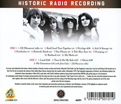 Patti Smith Group live from Jazz Workshop Boston, After their initial four shows at My Father’s Place in Roslyn, Long Island (Jan. 1 – 4 1976) the Patti Smith Group (Patti Smith, Lenny Kaye, Richard Sohl, Ivan Kral and Jay Dee Daugherty) then played the Jazz Workshop in Boston, which was broadcast live on WBCN-FM, and included this then-newly released version of “Gloria.” another excellent live album available now from Amazon. Patti Smith’s show at Paul Mann’s Jazz Workshop in Boston, on 9 January 1976. From one night of a 2-3 night stand with 2 shows/night, this may be the early or the late show. The venue is also unconfirmed – there are two venues in Boston next door to each other: “Paul’s Mall” and “The Jazz workshop”. The general consensus is that The Jazz Workshop is more likely. The sound levels are very quiet, but Patti’s voice comes through loud and clear in what sounds like a small club – the recording was apparently made by the radio station WBCN, but if that is the case, the sound quality is certainly not what one might like to hope to expect. The first song played, “We’re gonna have a real good Time together”, is missing here, along with five others, “Child of Paradise”, “Birdland”, “Time is on my Side”, “Gloria”, and the encore, “My Generation”.