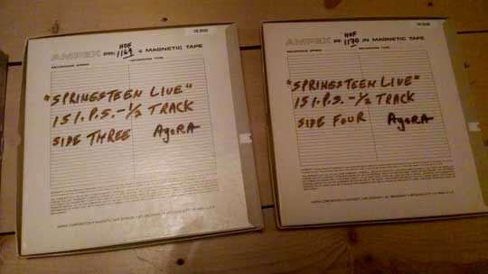 I found the seven Agora tape reels in a box that had been returned from the Rock’n Roll Hall Of Fame. The tapes were part of an exclusive Springsteen exhibit “Asbury Park to the Promised Land”. It wasn’t until the request to release this show came up that the tapes needed to be found. Not at Sony, not at Thrill Hill Archives, not at the archiving company. Last known location was the Rock’n Roll Hall of Fame. They informed me what box to look in and there they were, marked with the original indication of speed, tracks and show date.I had the tapes delivered to Plangent Processes for evaluation and transfer, if they seemed to be of adequate quality. After comparison to other copies of this show, this was the best version and potentially the original master tapes. Plangent transferred all seven reels using their unique process, which corrects any speed variations for accurate playback. This eliminates the wow and flutter usually found in the playback of any analog tape. This new transfer to the digital domain was done at 192 (samples per second) with 24 bit resolution. The resulting digital files were sent to Gateway Mastering for evaluation and mastering, as was done to the Box Set Volume 1, recently released to critical acclaim. The resulting new master will give a renewed vigor to the already exciting show.